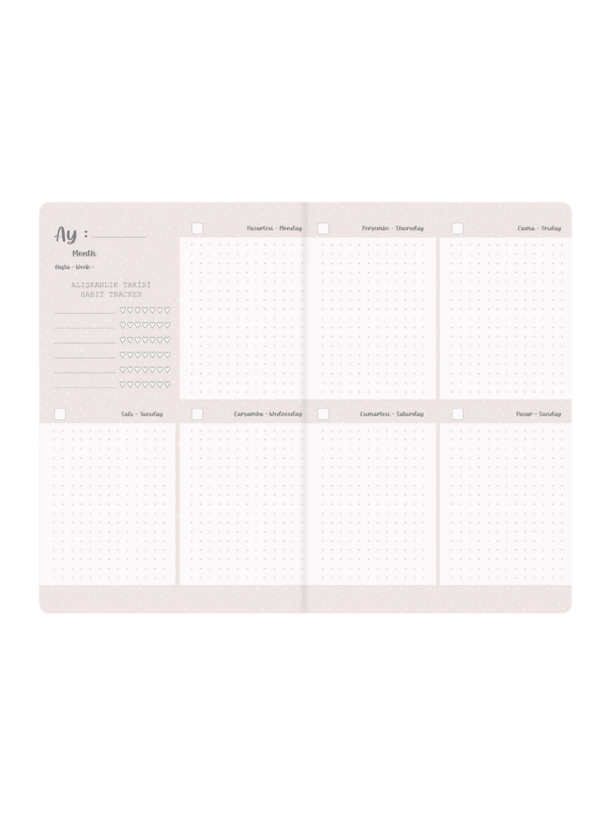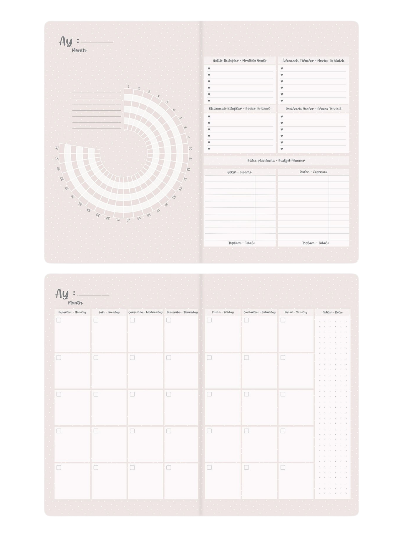 ყოველთვიური მიზნები, სანახავი ფილმები და ადგილები, წასაკითხი წიგნები და ბიუჯეტის დაგეგმვის სექციები ყოველი თვის დასაწყისში.